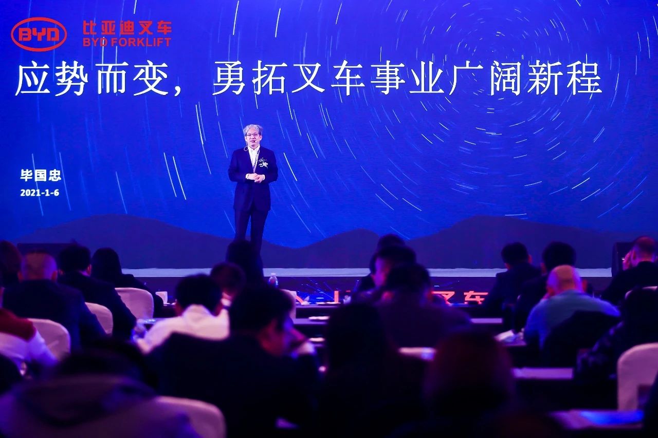 接下來,由比亞迪叉車總經理畢國忠先生致辭,畢總首先對在座嘉賓的蒞臨表示感謝,并指出2020年受疫情影響,對諸多行業來講都是較為艱難的一年,但比亞迪叉車在此種市場環境下,依然實現了逆勢增長,面對洶涌的浪潮和百變的形態,我們依然堅守于產品本身的價值。